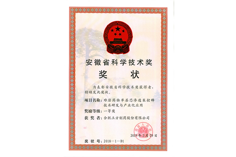 合肥立方制藥股份有限公司科學(xué)技術(shù)一等獎(jiǎng)